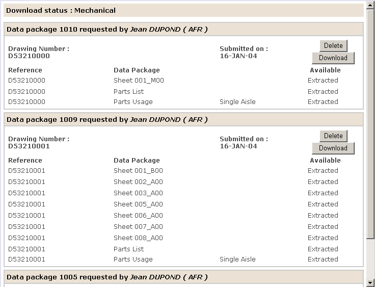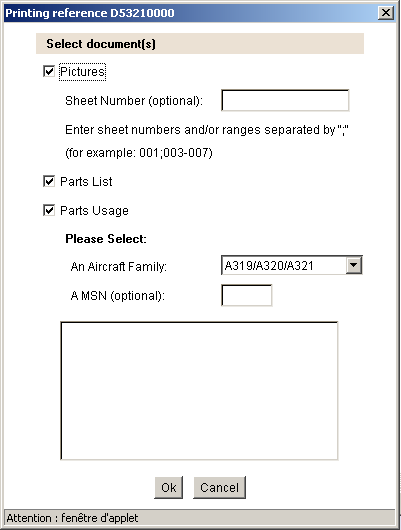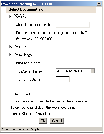 The extracted file format is a UNIX tar file containing TIF, JPG and/or PDF file.For the Mechanical Family, the Documents that can be downloaded are : Pictures, Parts List and Parts Usage related to a selected aircraft family.