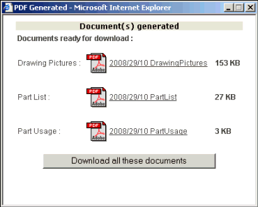Once element(s) of the drawing set is generated on server, a new window appears to offer you the possibility to download the PDF documentation.